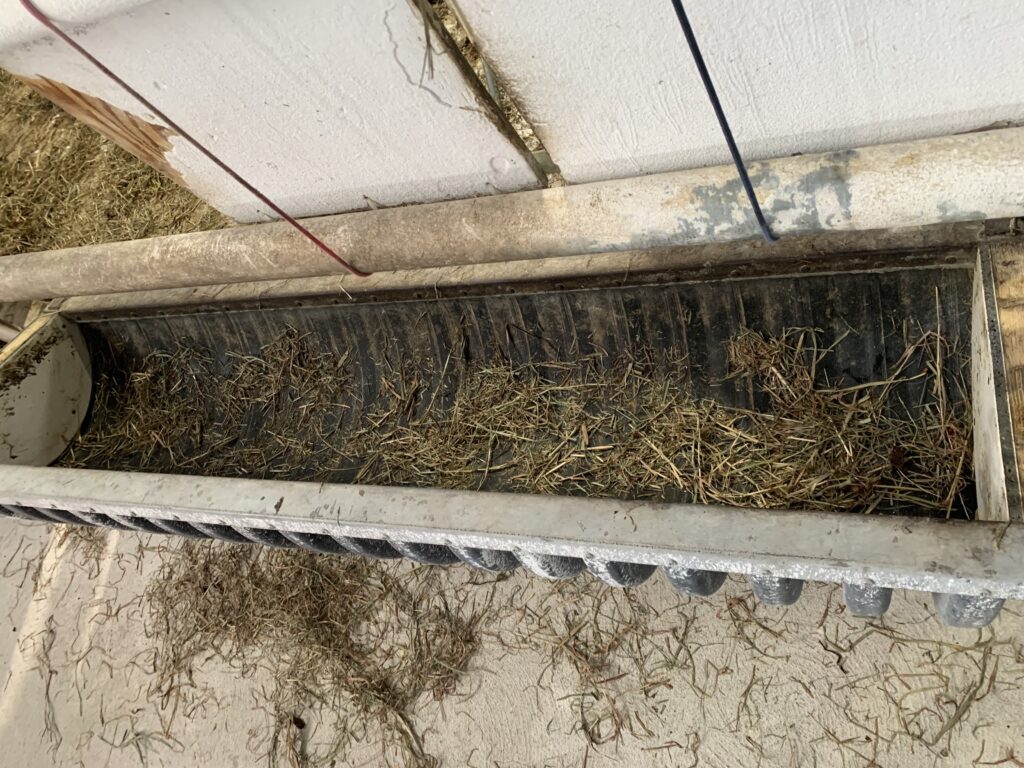 なので朝いちばんは、配合飼料より先に乾草をたっぷり入れる補充するところからスタートです。