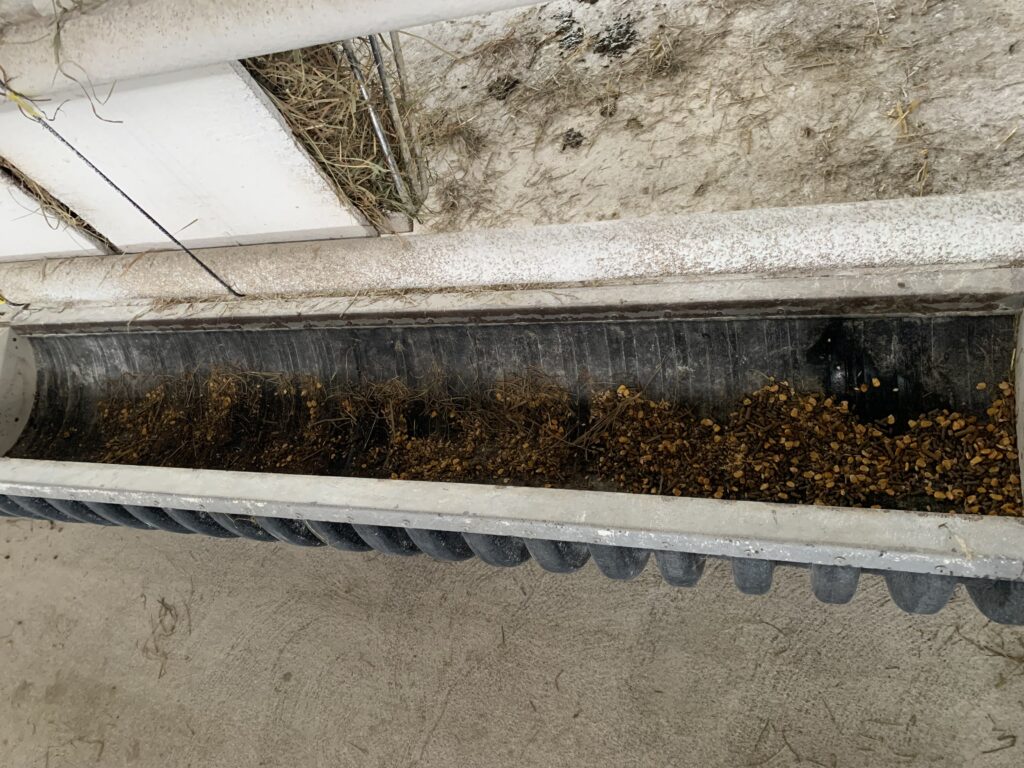 給餌前の飼槽はこんな感じ。前回の餌や乾草が残っていますね。