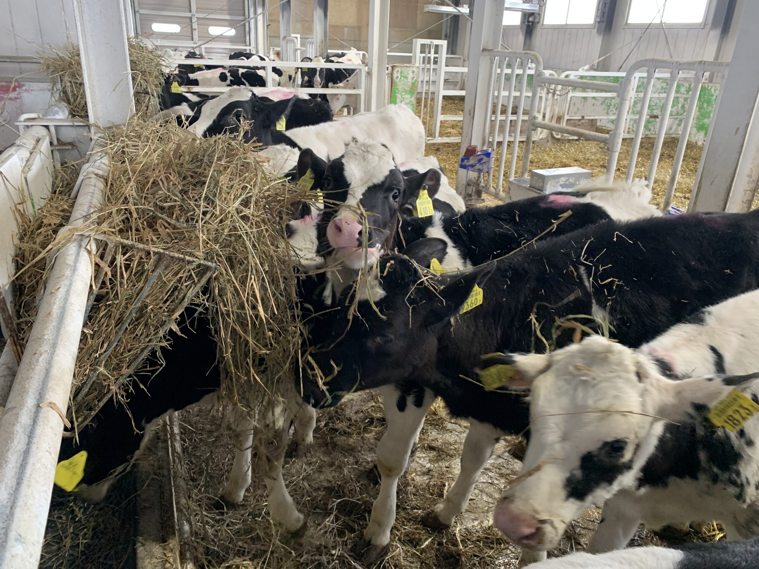 ちなみに乾草を先に与える理由は、粗飼料を先に口にすることでルーメン内が安定し、そのあとの配合飼料も食べ進めやすくなるからです。乾草は給餌の時間だけではなく、子牛がいつでも口にできるように常時置いています。